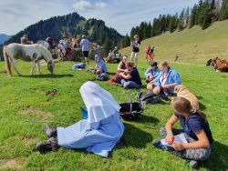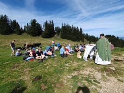 Freude und Euphorie weckte auch die musikalische Begleitung mit Gitarre, Ukulelele und Cajón. Wir freuten uns sehr, dass sich uns viele Gäste anschlossen, die unterwegs von der Bergmesse gehört hatten. Mit dabei waren auch tierische Weidebewohner, die das Geschehen mit Interesse verfolgten und sich auch einige Streicheleinheiten abholten.