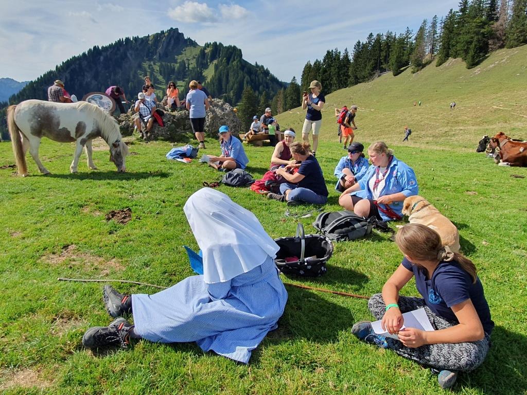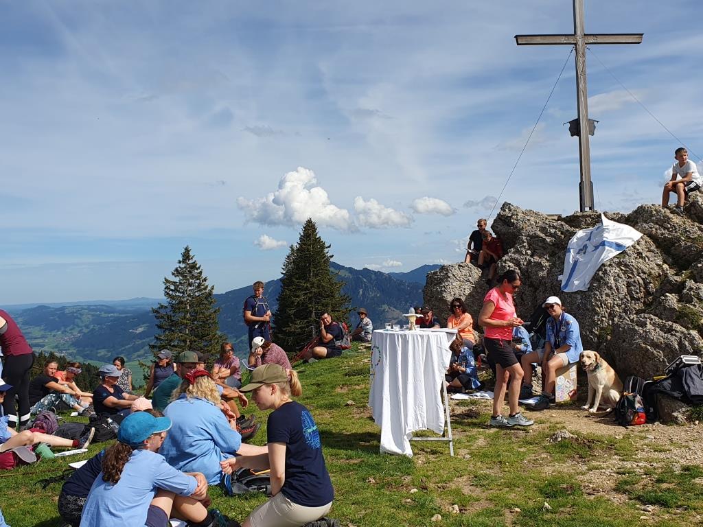 Hoch hinauf ging es am Sonntag, den 17. September. Um die 20 Bergfreund*innen trafen sich auf dem Bärenköpfle, um nach dem Aufstieg in kleinen Gruppen gemeinsam mit BDKJ-Präses Florian Stadlmayr eine Messe in 1.476m zu feiern. „Highlight“ lautete auch das Motto des Gottesdienstes. Nach einigen Statements zu den persönlichen Highlights des vergangenen Pfadfinder*innenjahrs, griff Florian das Thema auf und gab uns gleichzeitig folgende drei Wünsche für das neue Jahr mit auf dem Weg: Gelassenheit, Euphorie und das gemeinsam mit Jesus als Weggefährten.