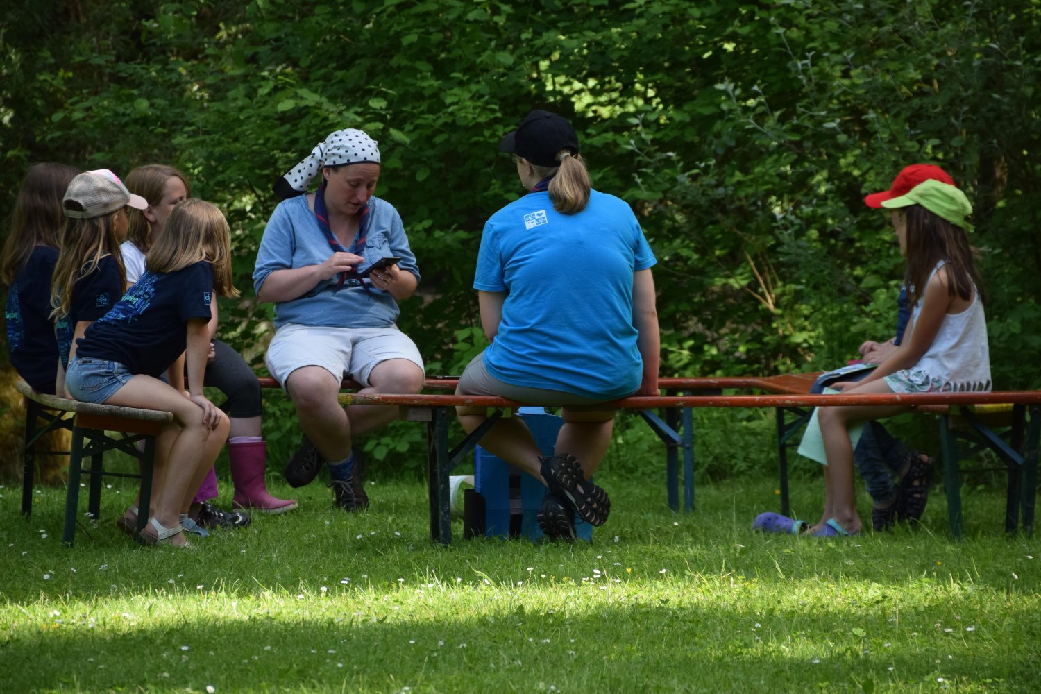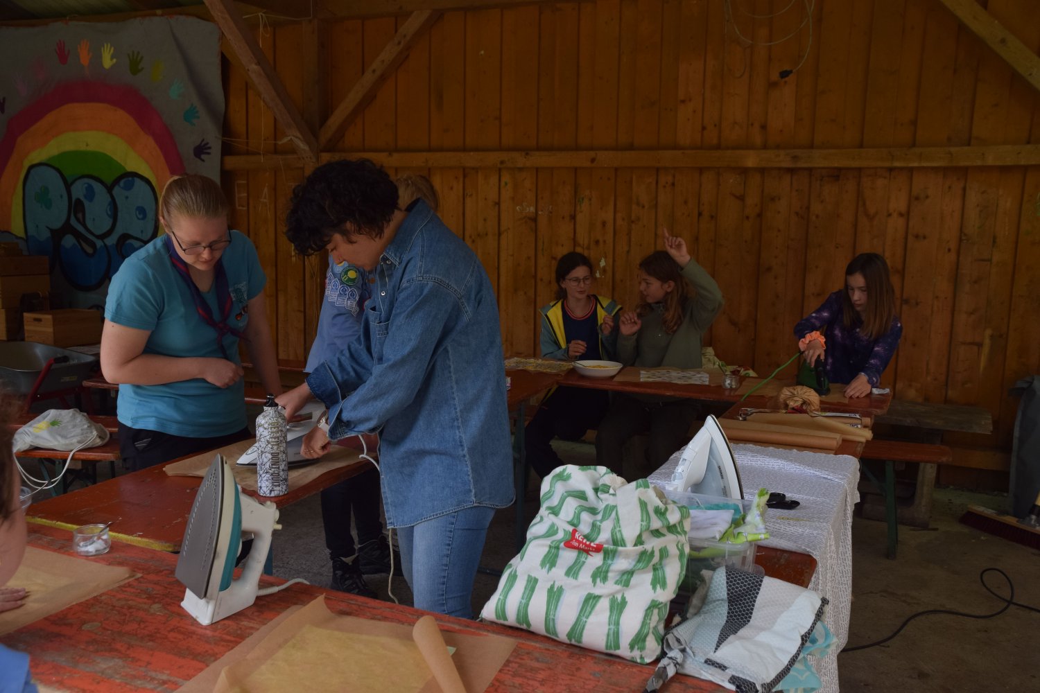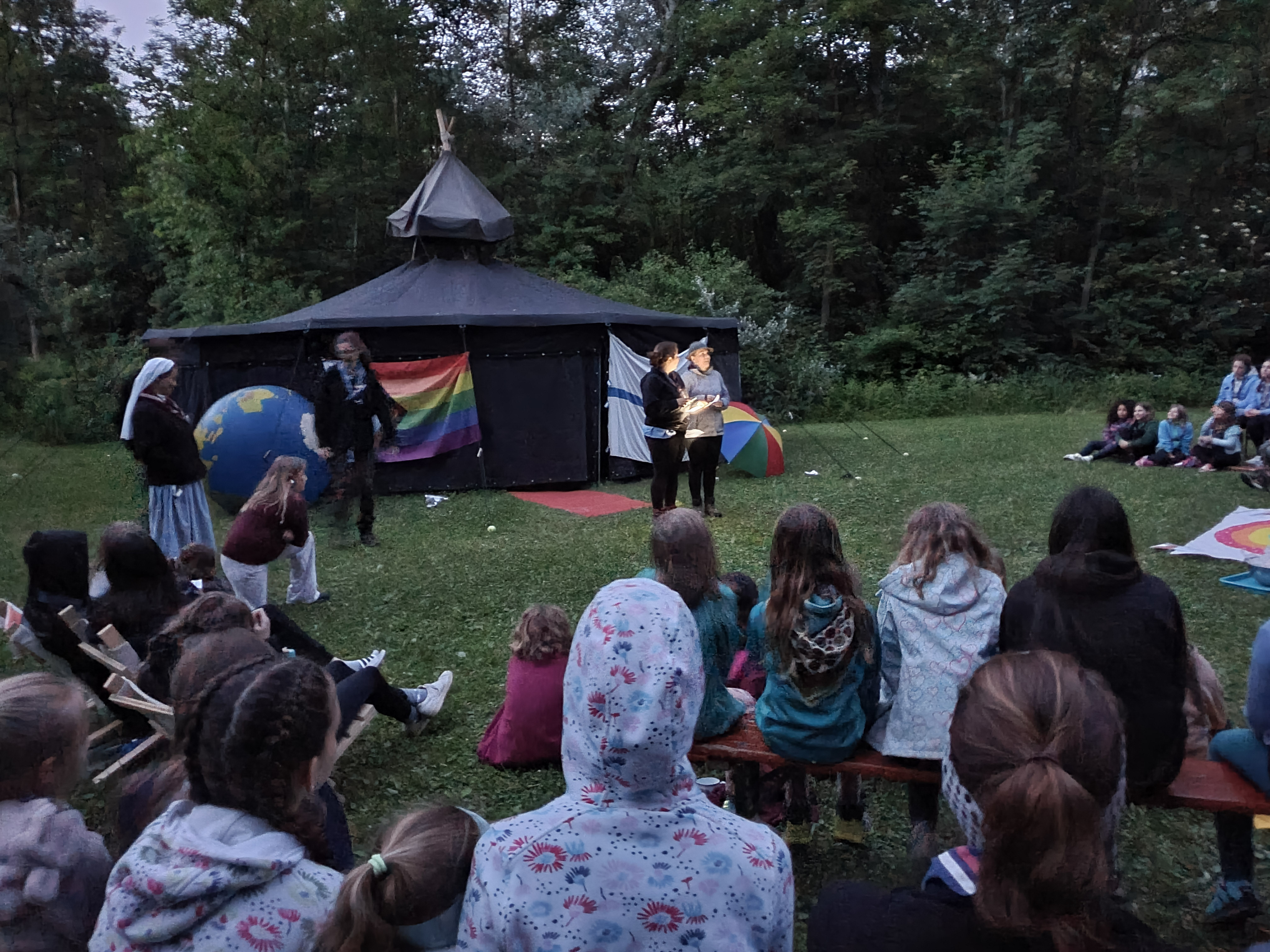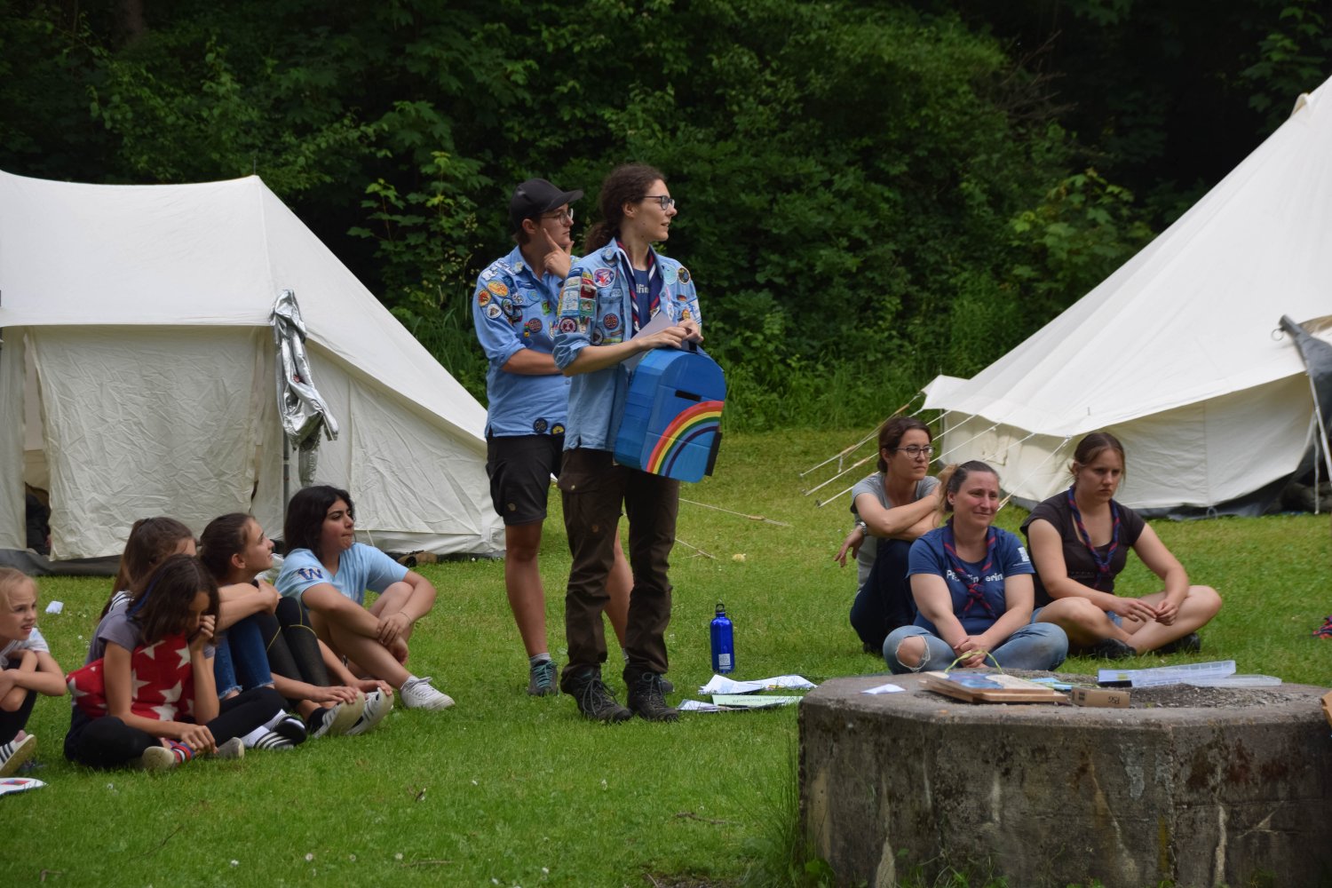 Im Regenbogenzelt fand auch der ReBoRa (Regenbogenrat) statt, an dem Pfadfinderinnen* allen Alters teilnehmen konnten, um ihre Meinungen, Wünsche und Bedürfnisse zu äußern. Gleichberechtigt mit den Leiterinnen* konnten sich alle austauschen, diskutieren und Kompromisse schließen. So konnten wir die basisdemokratischen Strukturen unseres Verbands auch auf dem Lager aufrechterhalten und allen Teilnehmerinnen* eine Stimme geben.